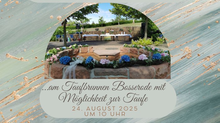 Am Sonntag, den 24. August feiern die Ev.-ref. Kirchengemeinde Obersuhl und die Ev. Martin-Luther-Kirchengemeinde in Wildeck ab 10 Uhr einen ganz besonderen Gottesdienst am Bosseröder Taufbrunnen: Wir erinnern uns an diesem Tage der Taufe und bieten zugleich Taufinteressenten die Möglichkeit an, sich im Taufbrunnen taufen zu lassen. Bei Interesse bitten wir Sie herzlich, sich im jeweiligen Pfarramt vorab zu melden.