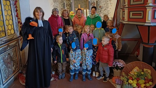 Der Altar und der Vorraum waren mit Erntegaben und Gaben für die Bebraer Tafel, die die Kinder in der vergangenen Woche in der Kita gesammelt haben, geschmückt. Der Rabe Rudi war auch mit dabei und hat den Kindern von der Bedeutung des Erntedankfestes berichtet. Aber auch die Kinder konnten dem Raben viel darüber erzählen und wussten, dass man an diesem Tag dem lieben Gott für die reiche Ernte dankt.