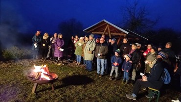 Einen besonderen Gottesdienst zur Wintersonnenwende erlebten rund 60 Menschen am 4.Sonntag im Advent am Grünen Band, dem Lieblingsort von Pia Gießler. Rund um Feuerschalen wurde mit vielen Kerzen und mitgebrachten Lichtern gebetet, zusammen mit BläserInnen gesungen und darüber nachgedacht, dass nun die Tage wieder länger werden und sich das Licht immer mehr Raum schafft. Mitten in der dunklen Nacht dachten alle darüber nach, dass mit dem Kind in der Krippe, auf dessen Ankunft wir in diesen Tagen warten, Gott das Leben aller Menschen hell macht.