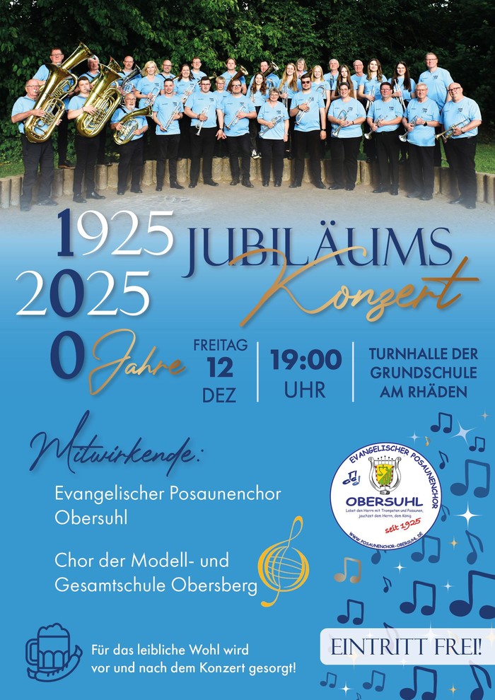 Vor und nach dem Konzert ist für Ihr leibliches Wohl bestens gesorgt. Feiern Sie mit uns 100 Jahre Evangelischer Posaunenchor Obersuhl und die reiche Musiktradition unserer Heimat – ein Abend voller Klang, Freude und gemeinsamer Erinnerung erwartet Sie.